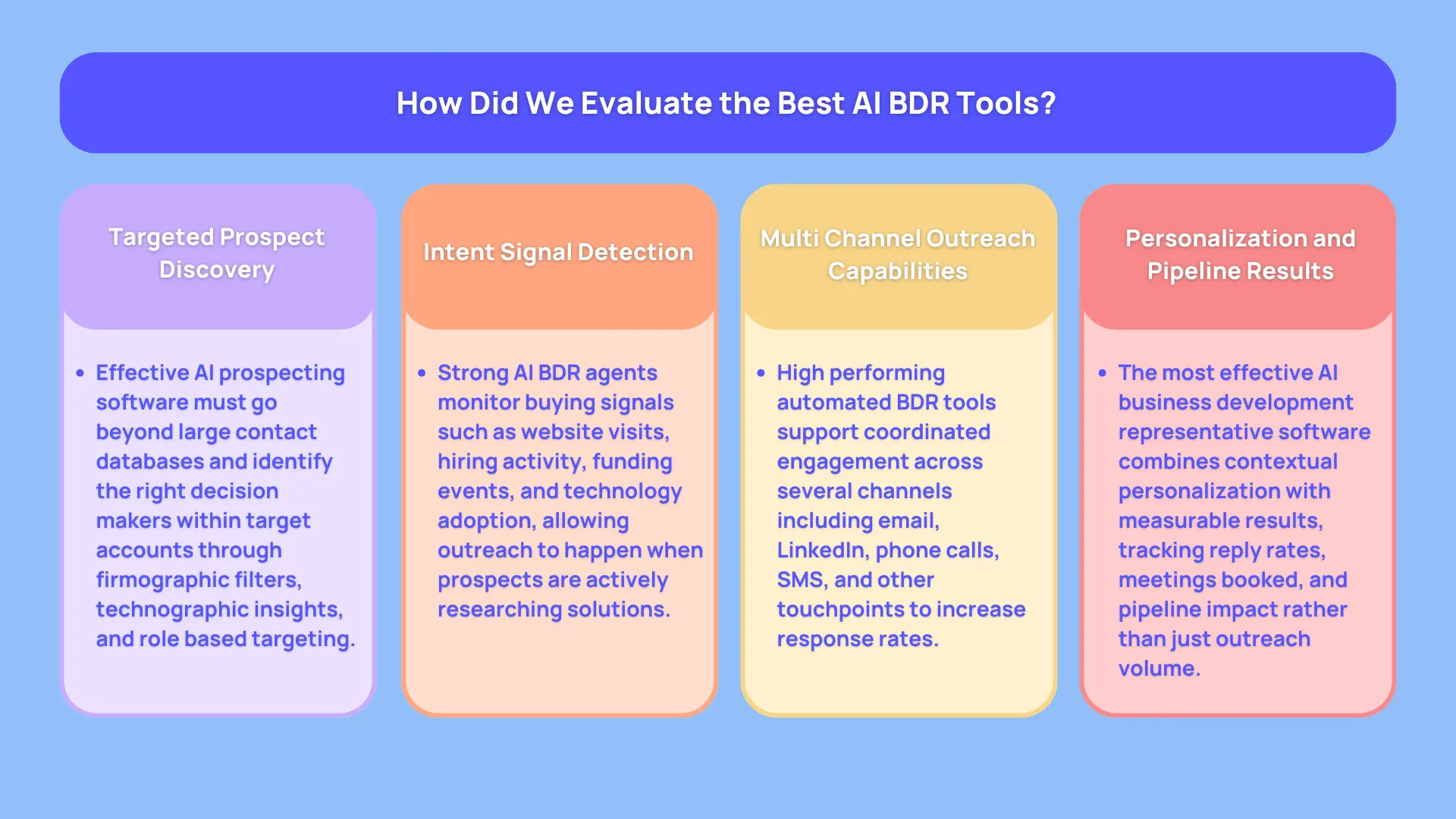 To identify the strongest platforms in the AI business development automation space, we evaluated each solution across several practical criteria that directly impact pipeline performance.