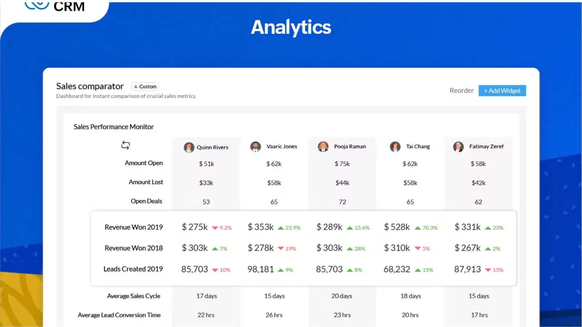 Instantly view conversion rates, opportunity stages, and call outcomes. - Customizable Reports