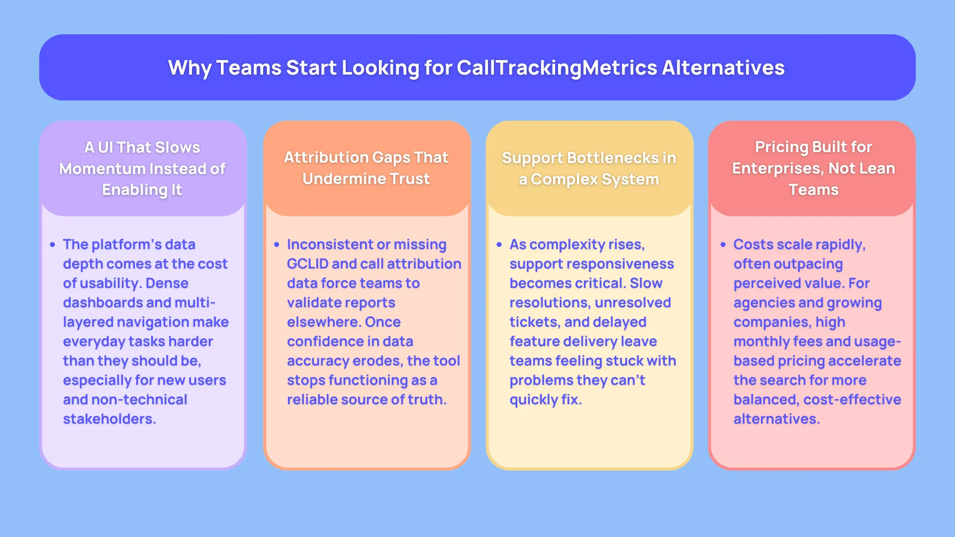 Below are the most common reasons teams begin comparing options similar to CallTrackingMetrics.