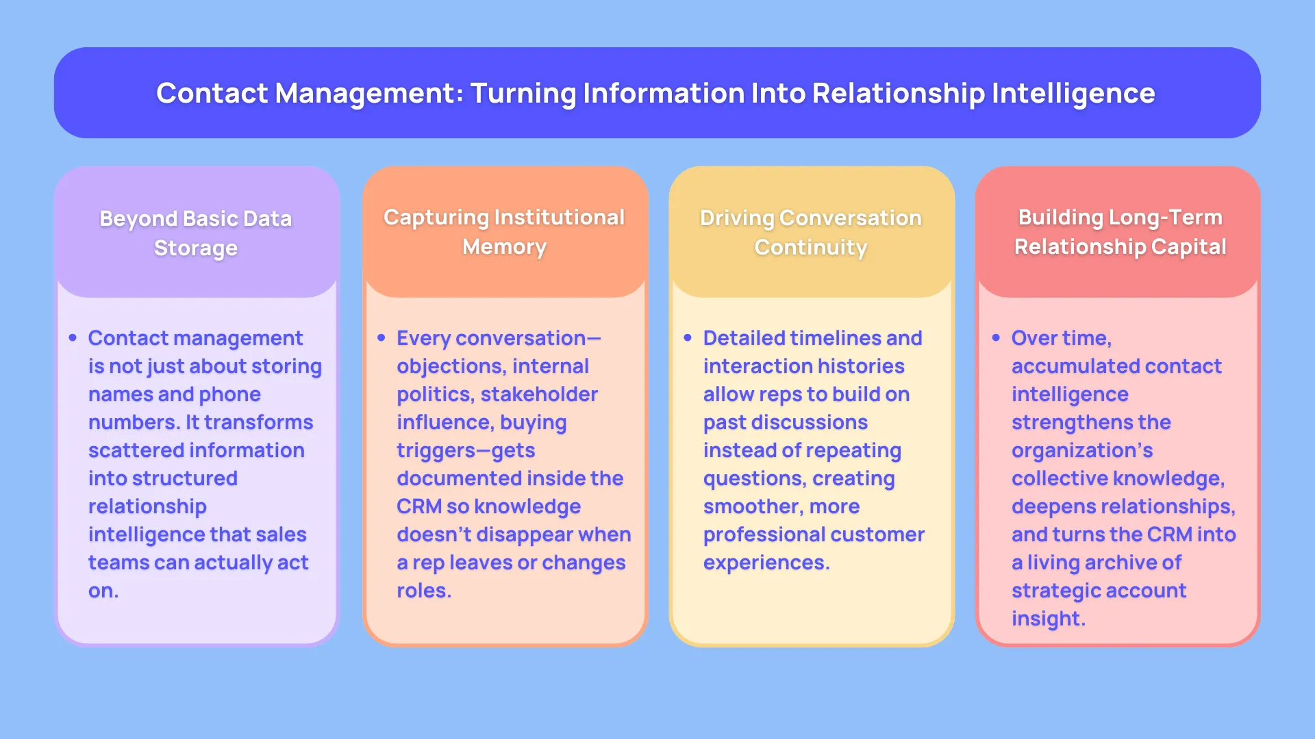Strong contact management captures more than contact details. It documents conversation patterns, stakeholder influence, buying triggers, past objections, internal relationships, and communication preferences.