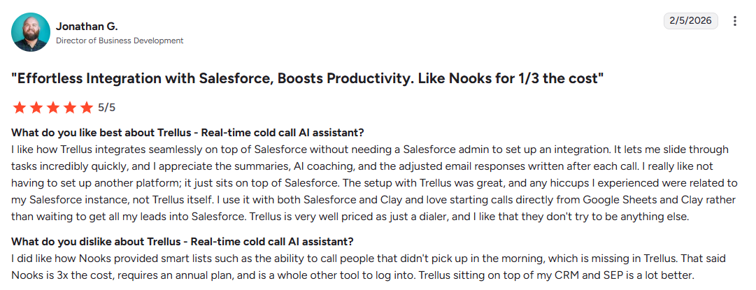 - Requires an existing calling system (HubSpot, Apollo, Salesloft, Outreach)