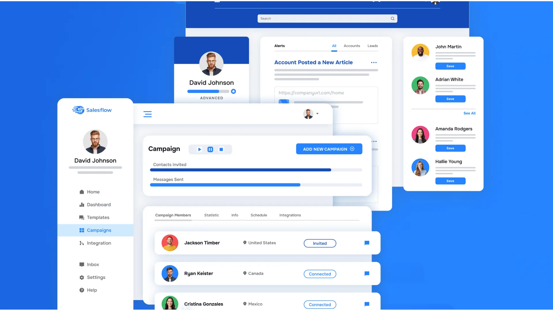 - Advanced analytics dashboard provides visibility into campaign performance, including invite rates, replies, and timelines