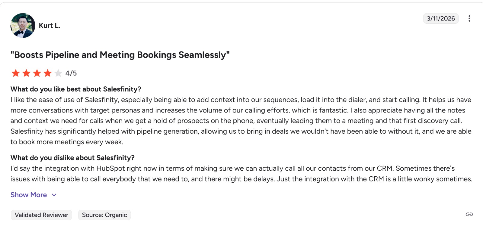 On top of that, its data enrichment capabilities and AI coaching tools give teams better prospect data, objection tracking, and performance visibility. Overall, Salesfinity is a strong fit for outbound teams looking for speed, automation, and better call preparation in one platform.
