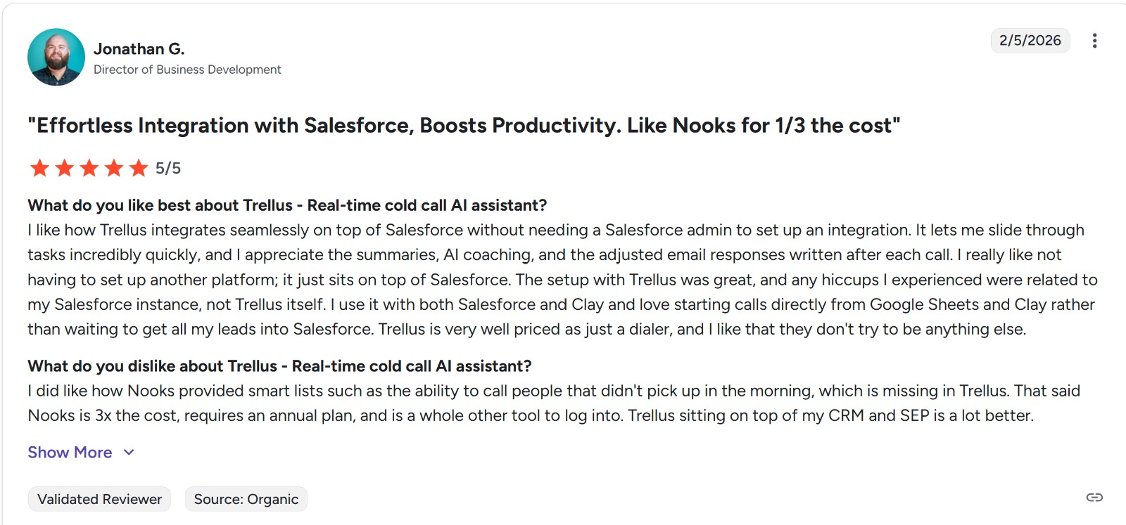 Other programs, such as Trellus, JustCall or Dialpad start at $59 per user/ per month. So, if pricing gap is something you’re looking at, then this pretty much sums it up on Nooks vs. Trellus or any other software.