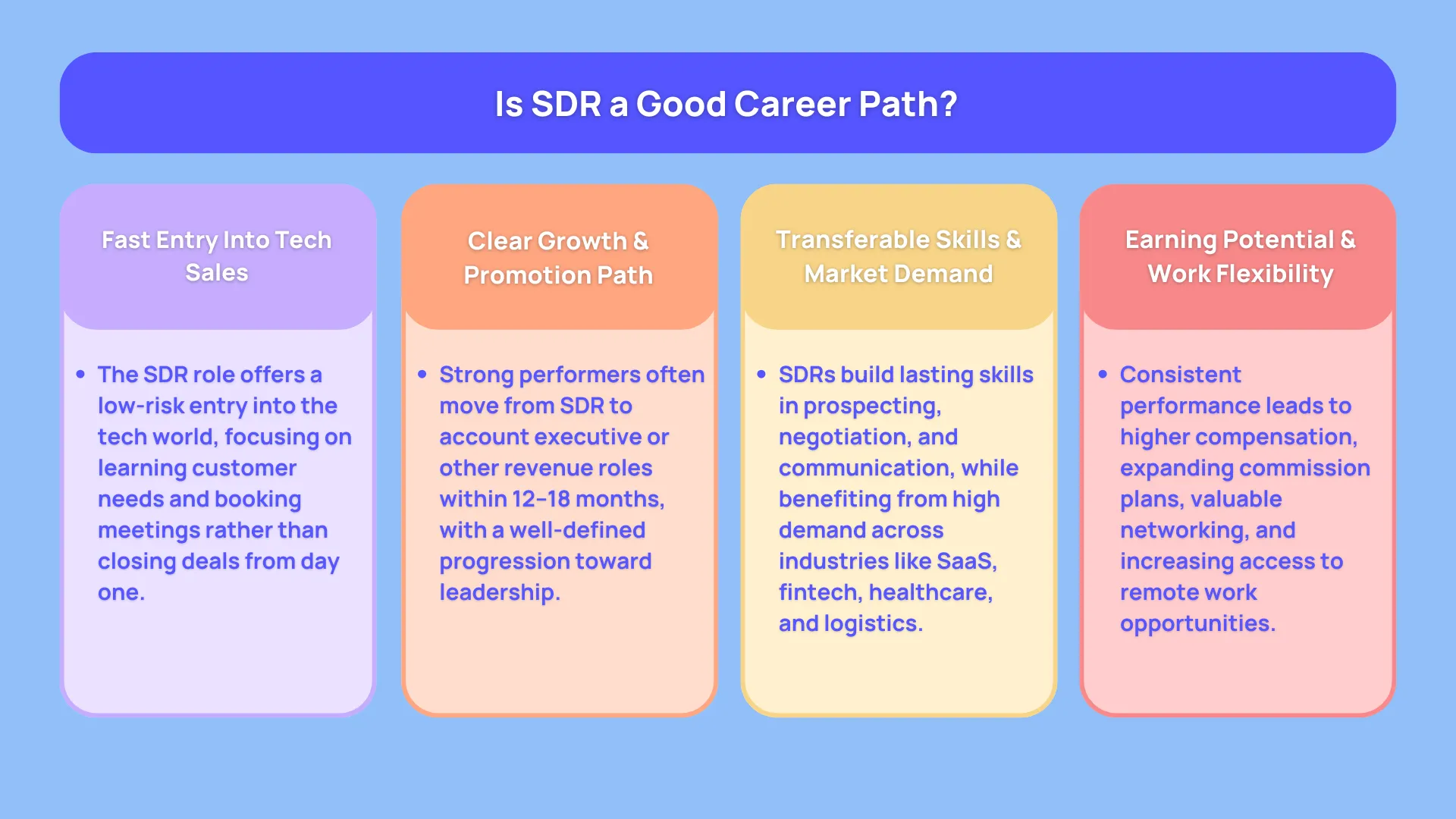 An SDR career gives you fast learning, skill development, and access to the tech world. It teaches negotiation, outbound prospecting, product positioning, objection handling, and resilience. These are skills that translate into almost any revenue role later.